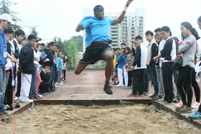 4月11日上午10:30本次校运会三级立定跳远预决赛在足球场主席台对面的沙坑进行。