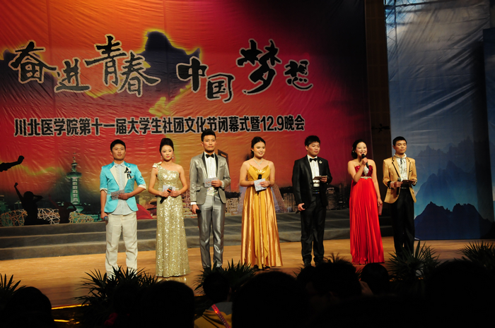 为激励青年学子铭记历史、担当使命、奋发成才,早日实现中国梦, 12月9日,以“奋进青春,中国梦想”为主题的川北医学院第十一届大学生社团文化节闭幕式暨纪念12.9文艺晚会在学校顺庆校区世纪礼堂举行。学校党委书记李成军莅临晚会现场,党委办公室、行政办公室,学生处,团委,各学生党总支以及思想政治理论课教研部的领导和老师们应邀出席,西华师范大学、西南交通大学以及西南交大希望学院社团联合会主席团与我校社联近900名协会会员一起观看了演出。