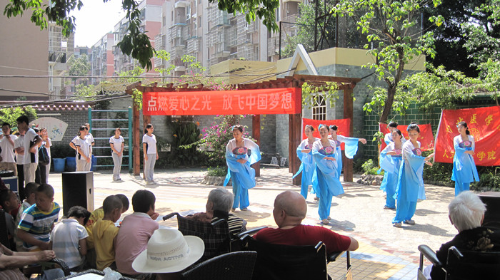 本次活动分为爱心捐赠、文艺表演和心灵交流三个部分。文艺表演前,外语人文党总支副书记曾恩泉和南充市道德模范叶千秀老人一起,向福利院捐赠了牛奶、大米、食用油和现金,并为在场的孩子们分发了糖果糕点。文艺组的同学为孩子和老人们献上了精彩表演。歌曲《给未来的自己》展示了当代大学生的活力与青春,独奏《年轻的朋友来相会》拉近了志愿者与老人们的距离,合唱《大海啊故乡》、手语舞《感恩的心》与舞蹈《卓玛》、《太极》赢得现场阵阵掌声,魔术表演更是把此次活动推向高潮。文艺汇演最后在孩子们认真的诗歌朗诵中结束。清扫完活动现场后,服务队的党员和志愿者们进入宿舍大楼与孩子和老人们进行了面对面的交流,拉近了彼此的距离,让他们感受到了温暖。