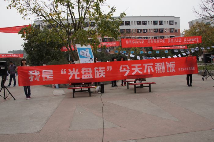 随着生活水平的提高,食物浪费现象越来越严重,学校食堂随处可见同学们剩下的饭菜,为了让同学们树立 “节约光荣”的思想,形成良好的节约观念,3月14日中午,护理学院在高坪校区太阳城广场举办了“拒绝舌尖上的浪费--光盘行动”倡议活动。