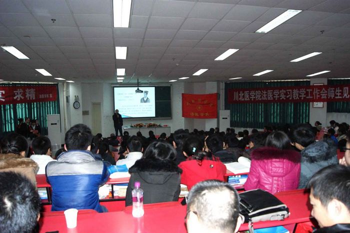 为加强师生交流,拓宽学生视野,近日,法医学系实习教学师生见面会在顺庆校区101教室举行。四川省公安厅刑侦局法医科科长副主任法医师杜宏,四川求实司法鉴定所所长副主任法医师王能义,法医学系副主任吴松,来自达州、泸州、资阳等全省十六市公安局的教师代表,法医学系全体学生参加了会议。