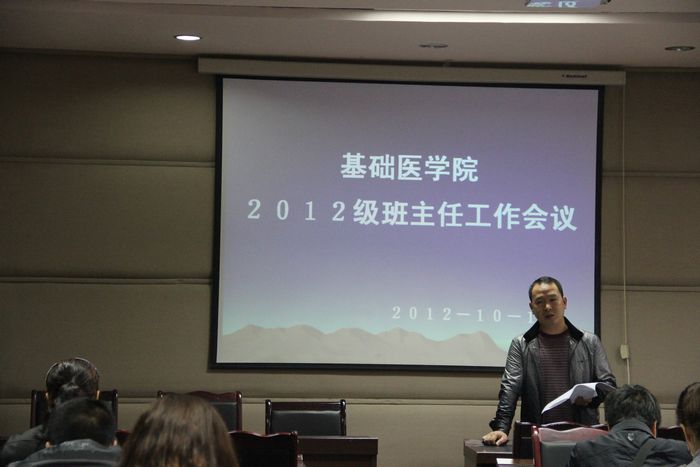 为加强新生班主任队伍建设,全面推进新生管理工作,基础医学院党总支于10月11日下午,在该院学术厅召开了2012级新生班主任工作会议。该党总支副书记林锋和2012级全体辅导员、新生班主任参加了会议。会议对班主任近期工作、各小班班委设置、班主任每个阶段的工作作了统一布置,要求班主任要迅速熟悉学生、尽快融入学生,主动带领学生开展主题活动,加强与学生思想交流,实现召开班会定期化,深入学生宿舍常态化。