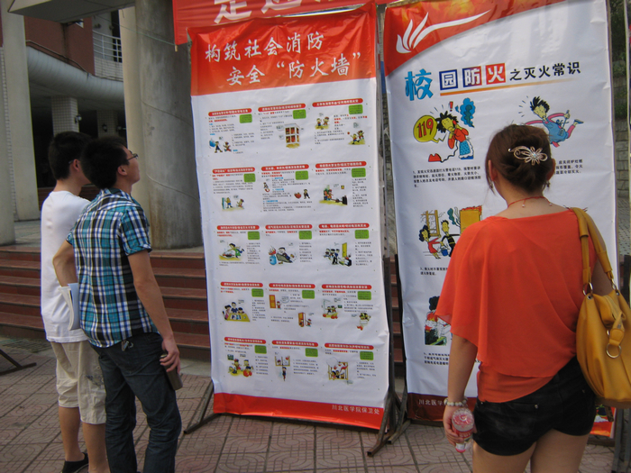 此次活动形式多样、内容丰富,主要包括消防安全知识展板展出、消防安全知识传单发放、常用消防器材使用方法演示。活动期间展出的消防安全知识宣传展板吸引了众多老师和同学的关注,大家纷纷驻足阅读学习展板上宣传的各类消防安全知识。学生义务消防队成员分为多支小分队,分别在顺庆校区第一教学楼、学生食堂门口及高坪校区太阳城向师生们发放以“关注消防,珍爱生命”为主题的宣传单,演示常用消防器材的使用方法,并耐心细致地解答大家的提问。