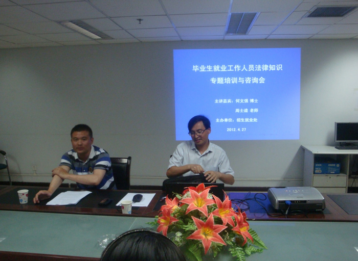4月27日下午,由招生就业处主办的毕业生就业工作人员法律知识专题培训与咨询会在招生就业处会议室举行。咨询会邀请了学校人文社科学院何文强和周士逵两位律师主讲,招生就业处全体工作人员和各院(系)就业工作相关老师及部分学生参加了咨询会。招生就业处副处长姚家赞主持咨询会。