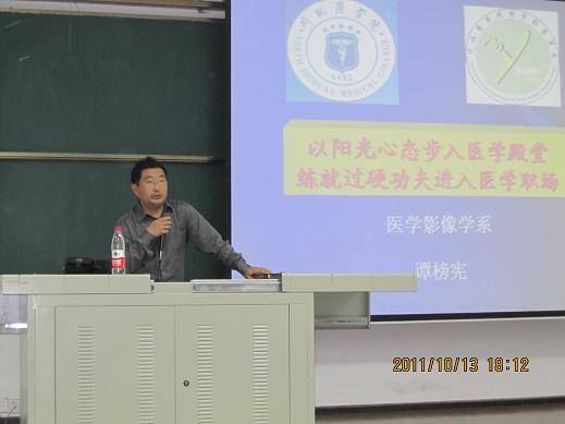 10月13日,由医学影像学系党总支主办的新生成才教育讲座在新区图书信息大楼202室举行。此次讲座由医学影像系副主任谭榜宪教授主讲,医学影像学系党总支副书记许旷宇及该系学生科全体教师等参加了讲座。