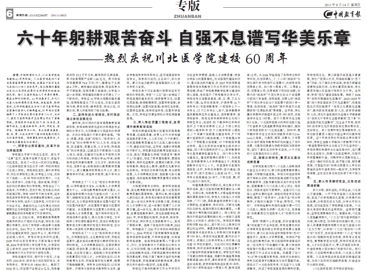 岁月如歌,扬帆远航。回顾过去,川北医人百感交集,一甲子艰辛造就川北医的辉煌,实现了办学规模的大发展,办学条件的大改善,办学层次的大飞跃,办学水平的大提高,成功地实现了学校跨越大发展。川北医从来没有像现在这样绚丽,这样朝气蓬勃,这样充满青春的活力。今天,一个热爱川北医,建设川北医,发展川北医的良好局面已经形成。展望未来,川北医人更是豪情满怀。“十二五”期间是学校提升内涵、突出特色、加快转变的关键时期,也是学校发展的重要战略机遇期。川北医人将紧紧围绕学校第六次党代会提出的“五大工程”,以学校“十二五”发展规划的“八项计划”为抓手,不断转变观念,创新教育发展方式,突出特色,提高质量,全面实现学校“十二五”发展规划提出的“规模结构更加合理,学科专业更显特色,教育教学更加优质,科学研究更有成效,人才队伍更具活力,育人环境更加和谐,社会服务能力更加突出”的宏伟目标。我们相信,川北医精神薪火传承,川北医人再谱新篇,川北医学院必将实现新的跨越式发展,创造更加美好、灿烂的明天,为四川地方及西部区域经济发展、社会进步作出新的贡献。