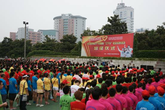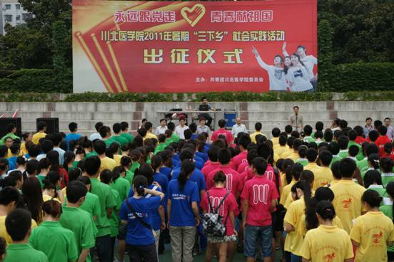 七月激情似火,七月青春灿烂。7月5日上午,我校2011年暑期“三下乡”社会实践活动出征仪式在顺庆校区篮球场举行。团市委书记史燚、团市委学校部部长王小东,党委书记凌保东、院长康健、党委副书记李成军以及党(院)办、宣传统战部、学生处、团委、各学生党总支相关部门负责人、辅导员、带队教师、实践队员等800多人参加了出征仪式。