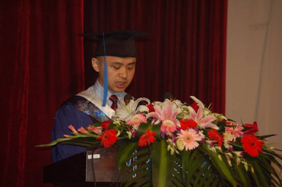 接着,毕业研究生代表马青松发言,代表2011届全体硕士毕业生对学校和老师的谆谆教诲和支持鼓励表示感谢。他表示,所有毕业研究生们一定会秉承校训,心怀感恩,牢记教诲,从新的起点开始,脚踏实地,勇往直前,为母校争光,为社会发展贡献力量。在读研究生代表胡珍发言,祝福所有毕业研究生在未来人生道路上取得更加辉煌的成绩。