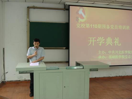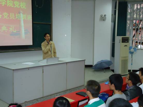 李成军副书记在开学典礼上作了重要讲话。他指出,对预备党员进行集中培训不仅是党员发展的必要程序,更是提升预备党员党性修养和党员意识的载体。他要求全体学员首先要端正学习态度,明确教学任务和要求,党员的先进性是要在不断地学习中实现和提高的,并且希望大家要在思考中学习,在学习中进步;其次,要围绕中心工作,体现共产党员先进性,力争做到争创先进、争当优秀;第三,要学以致用,在不断提高自身素质和能力的同时,注重在 “知校、爱校、荣校”、“成功、成才、成人”和“爱心、感恩心、责任心”等具体要求中发挥党员先进模范作用,要在优良学风班风校风建设中身先垂范,要将个人理想与国家民族命运紧密结合。并希望全体学员在迎接建党90周年、建校60周年之际,切实在创先争优活动中发挥作用,在组织上入党的同时努力做到思想上入党,争取早日成为合格党员。
