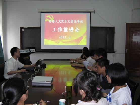 日前,外语人文党总支在药物研究所会议室召开创先争优工作推进会,该总支全体总支委员、各党支部书记及支部委员、学生科辅导员等参会。