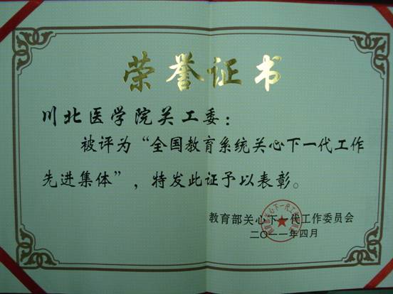日前,从教育部关心下一代工作委员会在北京举行的全国教育系统关工委成立20周年纪念大会暨第四次工作会议上获悉,我校关工委被授予“全国教育系统关心下一代工作先进集体”称号。