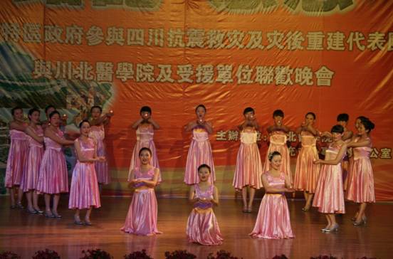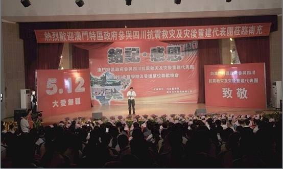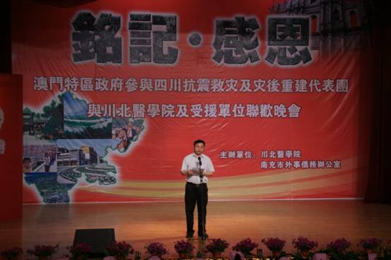 5月9日晚,由南充市外事侨务办公室与我校主办,校学生处、团委、附属医院、国际教育交流学院承办的“铭记·感恩”澳门特区政府参与四川抗震救灾及灾后重建代表团与川北医学院及受援单位联欢晚会在学校世纪礼堂隆重举行。
