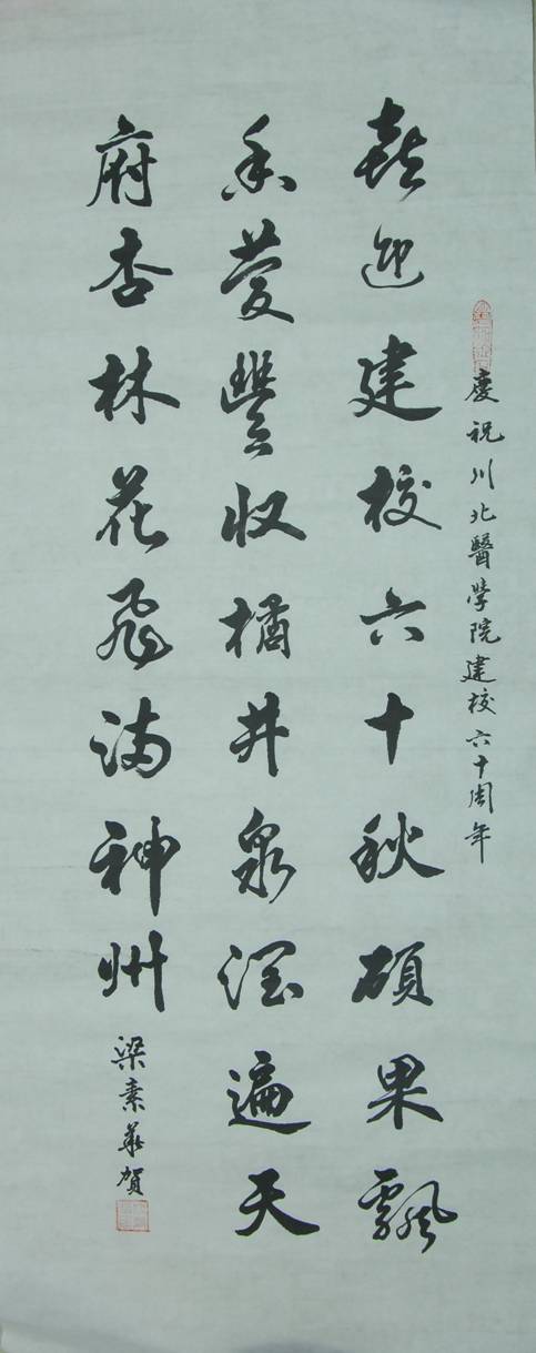 5月3日上午,我院生物学教授,硕士研究生导师梁素华老师利用课余时间,亲自来到学院宣传统战部办公室,送来她为学院校庆书画作品征集自创的诗词(毛笔书法系她的丈夫、西华师范大学陈家诗教授抄写)来表达她对学校60岁生日的祝贺和对学校的深深热爱。梁教授用自己朴实大方的诗句表达出了一位在教育工作岗位上兢兢业业的老教授对学校将要迎来的60周年校庆的期盼和喜悦,对学校60个春秋披荆斩棘、自强不息取得的辉煌成就感到由衷的骄傲和自豪。
