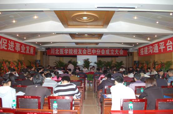 伴随着庄严的国歌声奏响,巴中校友工作研究分会成立大会隆重拉开帷幕。我校78级校友、巴中市政协教科文卫委员会主任尹治才发表了激情洋溢的欢迎致辞,他代表巴中片区校友对康院长一行的学院领导以及各位老师的到来表示热烈欢迎,同时对学院领导和老师对身在巴中的川北医学子的亲切关心表示衷心的感谢。尹治才详细介绍了巴中医疗卫生事业的发展现状和校友工作研究分会的筹备情况。学院招生就业处处长叶政宣读了“川北医学院校友工作研究总会关于同意巴中校友工作研究分会成立的批复”。在全体与会成员的热烈掌声中,大会审议并通过了《川北医学院巴中校友工作研究分会章程》以及《川北医学院校友工作研究会巴中分会基金管理办法》。大会选举产生了川北医学院巴中校友工作研究分会第一届理事会。我校78级校友、巴中市政协教科文卫委员会主任尹治才当选为川北医学院巴中校友工作研究分会第一任名誉会长。我校85级校友、巴中市中心医院科教科长党永忠当选为巴中校友工作研究分会会长。