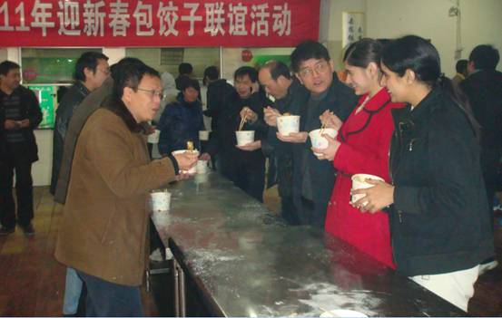 2月2日下午,我校高坪校区食堂里洋溢着欢乐的节日气氛。为让留学生们在节日期间感受到学校的关爱和温暖,体验中国传统佳节的喜庆氛围,学校党委书记凌保东、副院长李健及党办院办、国际教育交流学院、学生处、后勤产业处、保卫处等部门的部分同志和留学生们以及留校的中国学生欢聚一堂,包饺子、互致新春问候。
