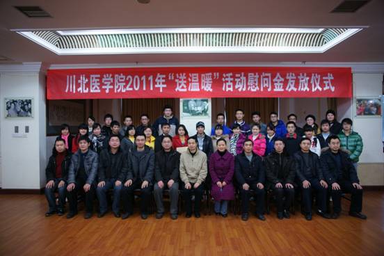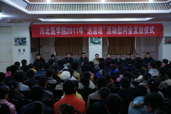 为缓解家庭经济暂时困难学生的生活问题,促使其愉快学习、健康成长, 2011年1月6日,我院送温暖活动慰问金发放仪式在顺庆校区隆重举行。学院党委副书记李成军教授以及学工系统相关负责人参加了此次活动。