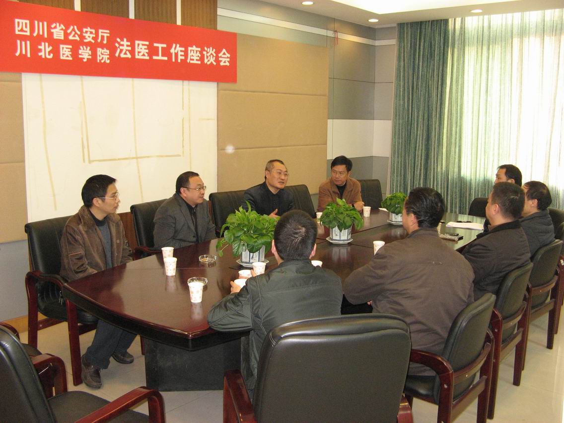在四川省公安厅刑事技术处,杜勇副院长一行受到了公安厅刑事侦查局局长胡钢、副局长易俗等领导的热情接待。双方在诚恳友好的氛围中召开了四川省公安厅和川北医学院法医工作座谈会。胡钢局长指出我院法医学系专业定位准确,培养人才对口,为基层公安系统输送了大量紧缺人才,鼓励我们坚持目前专业方向,并进一步加强培养学生实践能力。胡局长还在会上提出共同出版面向全省司法系统法医、刑侦技术工作者的专题学术论文集和在我院举办法医专业技术交流学术会议等重要提议。刑事技术处副处长王庆红就当前法医技术领域一些亟待解决的热点、难点问题与我院法医学系教师进行了专业交流。