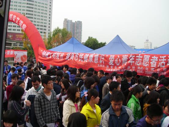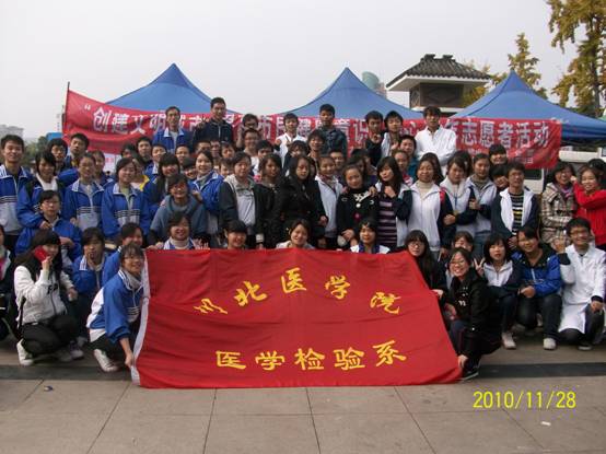 为传承青年学生服务社会的优良品德,提高当代大学生的综合素质,秉承“创建文明城市,提高市民健康意识”的宗旨,由南充市中心血站和川北医学院医学检验学系联合举办的“无偿献血验血”大型公益活动于2010年11月28日在北湖公园举行。