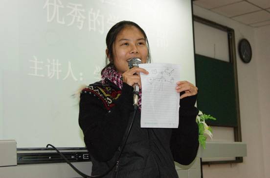 讲座一开始就别开生面,李书记让同学们把心目中的学生干部用图画的形式表现出来。有的同学画了一只手认为学生干部应该具备很强的动手能力;有同学画了一颗螺丝钉认为干部是群体一份子,哪里需要就往哪里钻;有同学画了莲花认为学生干部要随时保持出淤泥而不染的品质……同学们积极参与,互动性很强。在接下来2个小时的讲述中,李书记从干部的职责和功能,应该具备的素养和能力,应该注意的几个关系,以及培养各种能力的途径四个方面进行了讲述。整个讲座有理论、有实例,既生动有趣,又引人深思。不时引来阵阵掌声。讲座最后,李书记用一句 “勤学习、会思考、努力工作、求取好成绩”作为总结,勉励大家当好优秀的学生干部。讲座由2010级办公室主任林锋主持。来自2010级年级办的全部辅导员,团总支学生会全体干部、各小班班委一共320多人聆听了本次讲座。
