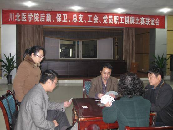 12月3日下午,后勤党总支与后勤分工会在川北大厦三楼学院工会俱乐部,联合开展了棋牌比赛联谊活动。后勤、保卫部门的党员、职工济济一堂,进行了相互交流,并举行了象棋、跳棋、双扣比赛,整个活动其乐融融。