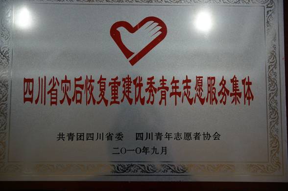 2010年9月,共青团四川省委、四川青年志愿者协会对我省2009年以来积极投身灾后恢复重建,在生活救助、支教助学、科技普及、环境保护、赛会服务、法律援助、心理抚慰、秩序维护、应急救援、抢险救灾以及其他社会公益领域广泛开展志愿服务活动中涌现出的一大批优秀志愿者及志愿者组织进行了表彰。由于我校针对灾后恢复重建工作开展了支教助学、科技普及、环境保护、心理援助、医疗服务等志愿服务活动,得到上级相关部门和社会的高度评价,共青团四川省委、四川青年志愿者协会授予我校“四川省灾后恢复重建优秀青年志愿服务集体”的光荣称号。