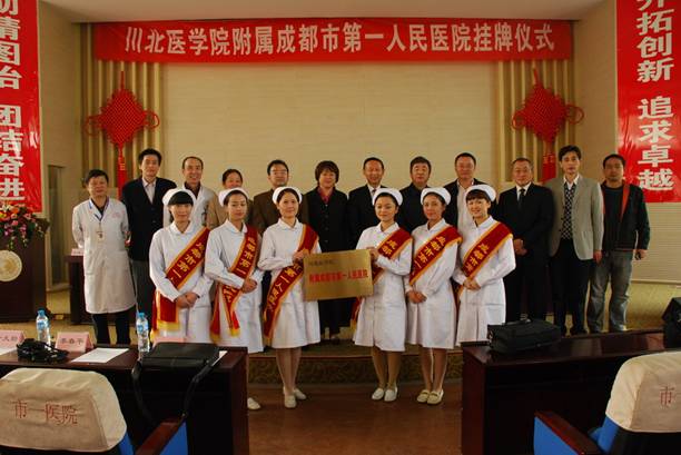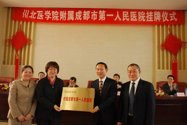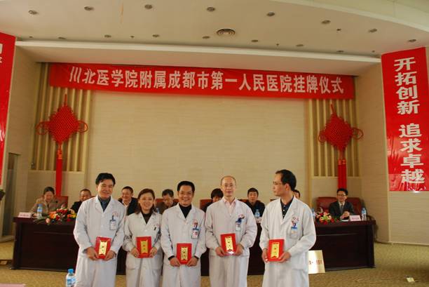 成都市卫生局科教处魏心斌处长宣读了“成都市卫生局关于成都市第一人民医院与川北医学院建立附属成都市第一人民医院(非直属附属医院)的批复”,学院副院长杜勇宣读了“川北医学院关于聘任成都市第一人民医院顾兴平等同志为兼职教授或副教授的通知”,主席台领导为受聘兼职教师颁发了证书,康健院长、杜勇副院长、顾兴平院长、彭晓红书记一起为川北医学院附属成都市第一人民医院揭牌。
