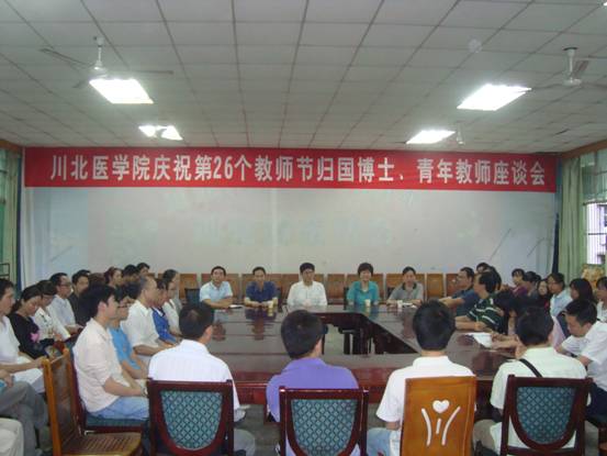 2010年9月9日下午,学校举行了归国博士、青年教师座谈会。会议由工会副主席杨竹秋主持,学校党委书记凌保东、院长康健、党委副书记李成军、人事处处长董国礼、留学归国博士代表以及全体新教师参加了座谈会。