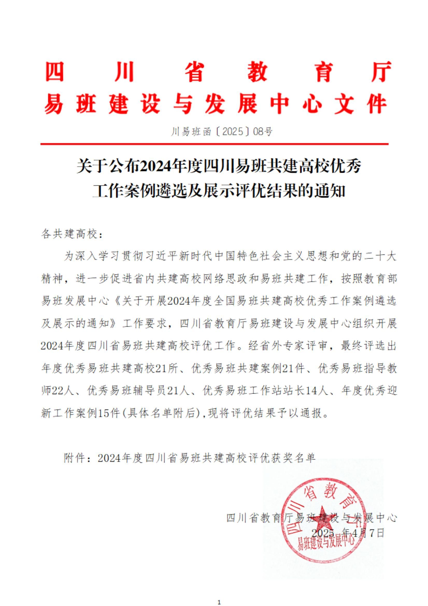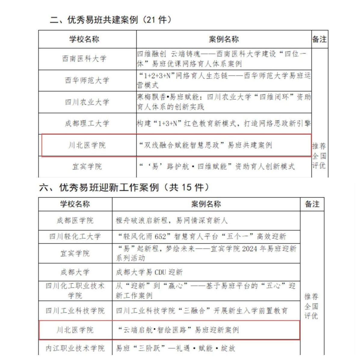 近日,四川省教育厅易班建设与发展中心公布了2024年度四川易班共建高校优秀工作案例遴选及展示评优结果。我校在此次评选中表现出色,在全部6项优秀评选中均成功入选,充分彰显了过去一年学校在网络思政和易班共建工作方面的突出成效。
