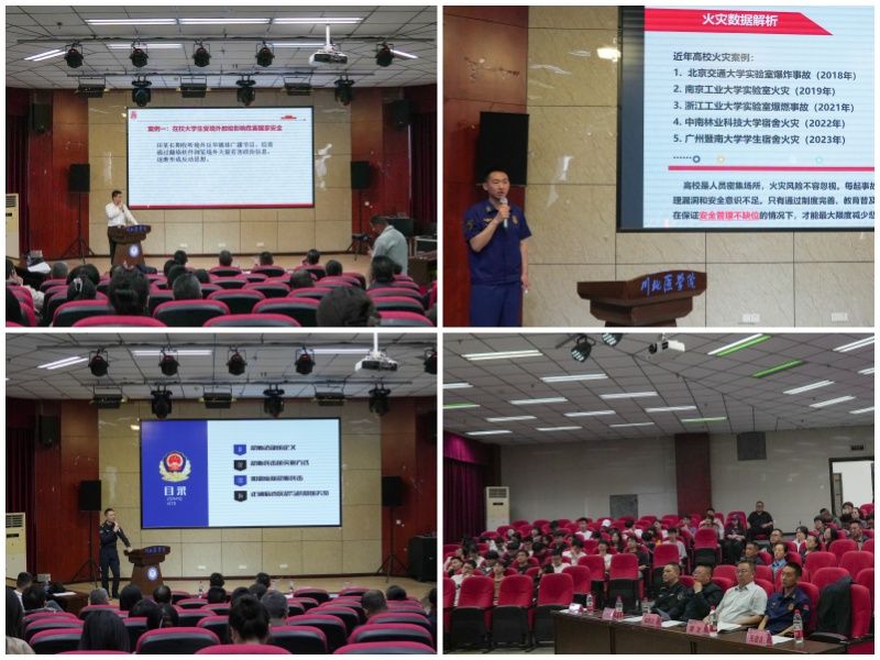 活动邀请了高坪区消防救援大队副大队长廖龙、高坪公安分局特警大队副大队长杜斌等为师生开展安全教育专题讲座。讲座结合真实案例,详细讲解了总体国家安全观的丰富内涵,以及如何防范危害国家安全的行为。结合高校火灾案例,形象地介绍了火灾的原因和灭火、火场应急疏散逃生注意事项等基本常识,从预防火灾角度,细致深入讲解了日常消防安全管理。从恐怖活动的定义、恐怖袭击的实施方式、如何应对暴恐袭击等方面讲解了反恐防暴常识。