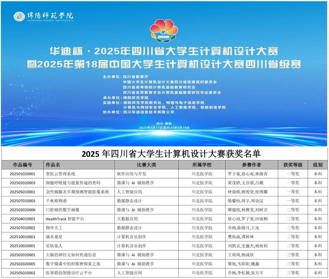 5月17日至18日,由四川省教育厅主办的2025年四川省大学生计算机设计大赛在绵阳师范学院举行,我校选拔推荐的学生代表队伍再获佳绩。