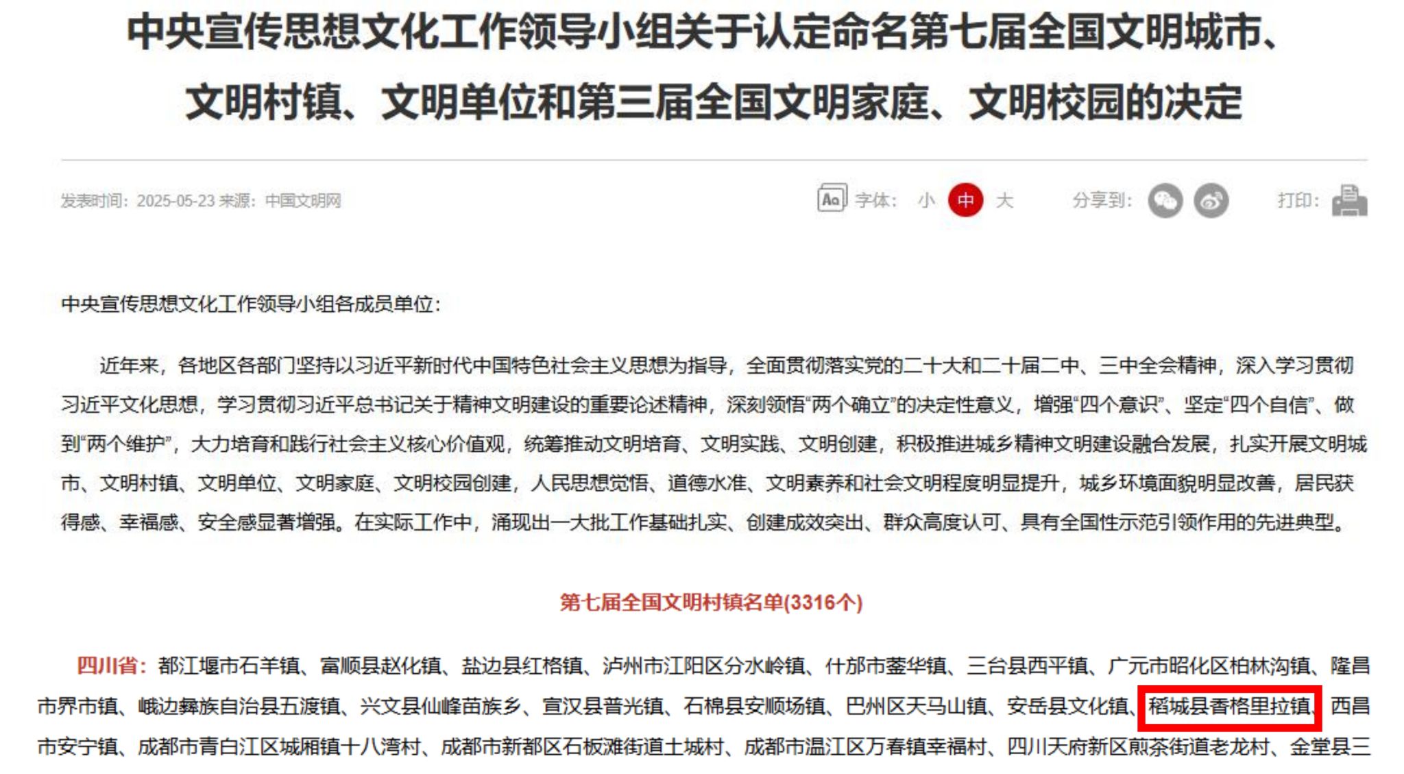 全国精神文明建设表彰大会5月23日在京召开。会上传达了习近平重要指示。中央宣传思想文化工作领导小组印发了《中央宣传思想文化工作领导小组关于认定命名第七届全国文明城市、文明村镇、文明单位和第三届全国文明家庭、文明校园的决定》。我校定点帮扶的稻城县香格里拉镇获评“第七届全国文明村镇”称号。