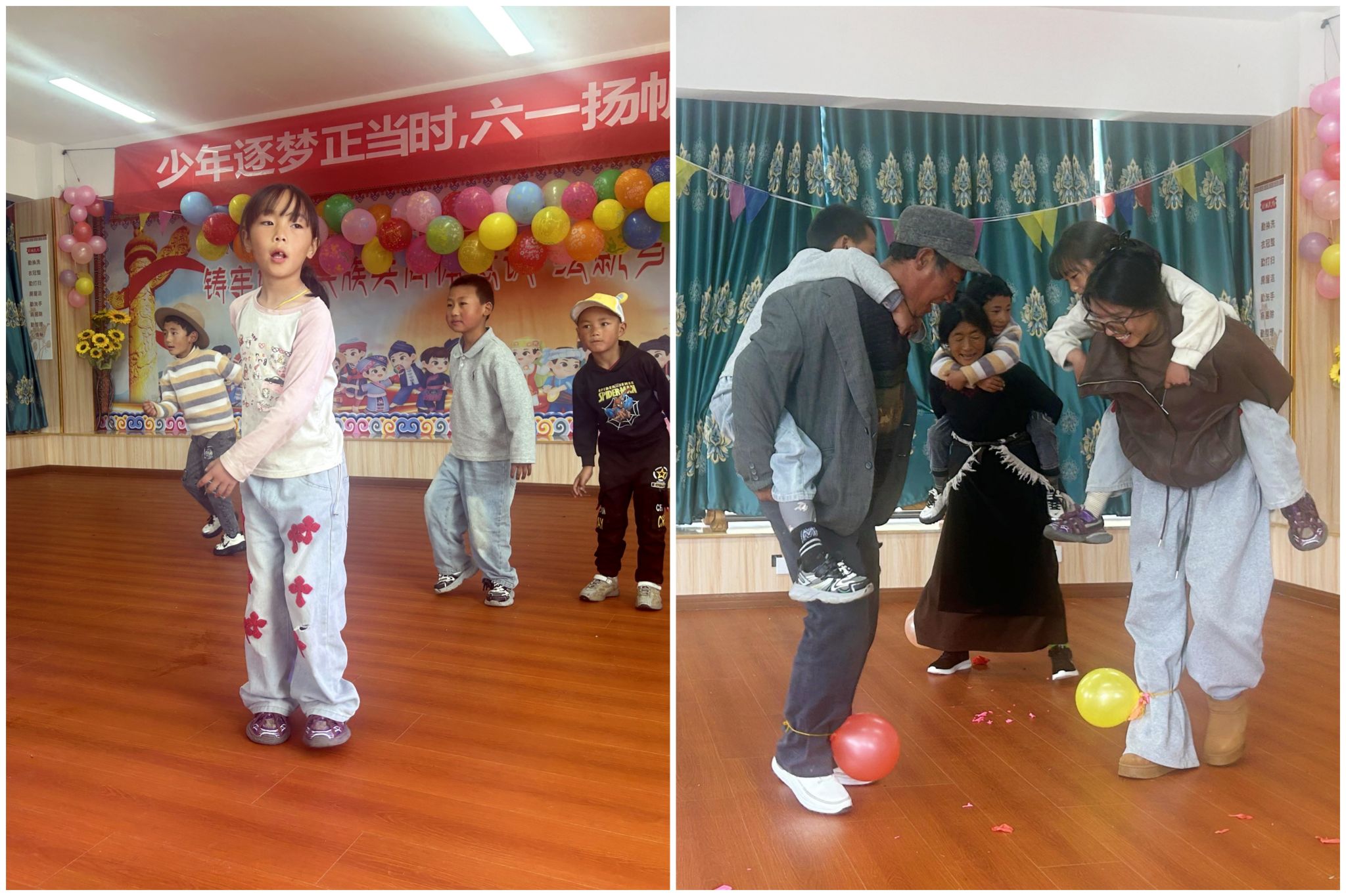 趣味活动依次展开,“欢乐踩气球”中,孩子们脚绑彩球你追我赶,气球爆裂声与欢笑声交织;“趣味接力赛”上,各组队员如离弦之箭般奋力冲刺,尽显团结协作精神;“蒙眼敲鼓” 环节,孩子们在同伴指引下摸索前行,鼓声伴着脸上自豪的光彩。才艺展示环节亮点频出,幼教点的儿童,以优美灵动的舞姿演绎民族风情,赢得阵阵喝彩;亚丁学堂的孩子们声情并茂地演诵《游子吟》,表达感恩之情,令现场家长深受触动。