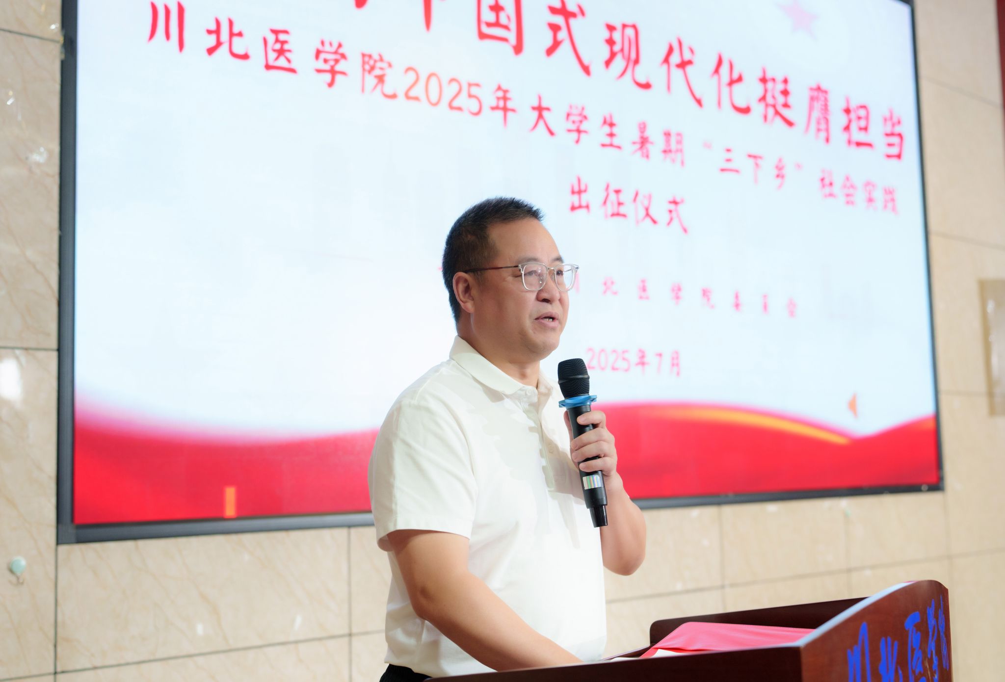邓世山为实践团队作动员讲话,提出四点殷切期望:一要筑牢理想信念,用脚步丈量祖国大地,厚植家国情怀;二要坚持知行合一,将医学专业知识转化为服务基层的实际能力;三要发扬艰苦奋斗精神,在走村入户中锤炼“川北医精神”;四要严守安全底线,确保实践活动平安有序。他指出,今年“青春为中国式现代化挺膺担当”的实践主题,是学校深化“三全育人”改革的重要举措,勉励师生把社会实践作为“行走的思政课”,在服务健康中国和乡村振兴战略中彰显医学院校的责任担当,让青春在党和人民最需要的地方绽放绚丽之花。