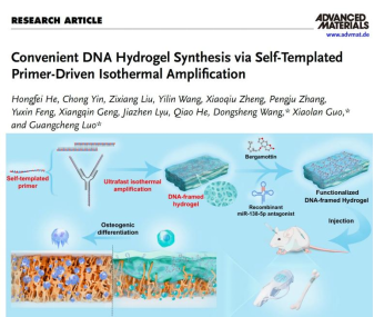 DNA水凝胶是一种具有广泛临床应用潜力的新型纳米材料,尽管其在生物相容性、免疫原性方面独具优势,但也存在调控策略欠缺、制备效率低下、生产成本高昂等缺陷。对此,我校检验团队在深入探索核酸非特异性扩增机制的基础上(相关研究成果发表于Clinical Chemistry,2023),进一步创新地提出了“自模板引物触发的超快速等温扩增”的新策略。自模板引物本质是一条短串联重复序列,极易形成引物二聚体,能在1分钟内触发高效的DNA滑动扩增,30分钟内合成大量DNA,dNTPs的利用率远超其它核酸扩增技术。鉴于“自模板引物等温扩增”的快速高效特性,研究团队将其用于制备DNA水凝胶这种需要超高浓度DNA的核酸纳米材料。该纳米材料具有良好的生物安全性,载药后可作为骨填充材料促进骨组织生长。此外,DNA水凝胶在药物靶向递送、组织工程修复、生物分子传感及生物制造等领域均具有广泛的临床应用价值。