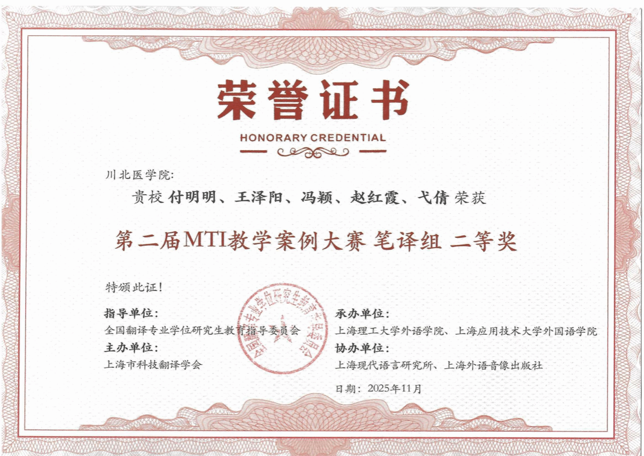近日,由全国翻译专业学位研究生教育指导委员会指导、上海市科技翻译学会主办的2025 MTI(翻译硕士专业学位)案例教学研讨会暨“第二届MTI教学案例大赛”颁奖典礼在上海应用技术大学落幕。此次大赛汇集了全国122所MTI院校的227份教学案例。经大赛评委会初评、复评,我校付明明博士团队申报的案例《AI驱动与跨学科融合--医学英语笔译四维协同创新路径及实践应用》斩获笔译组二等奖。