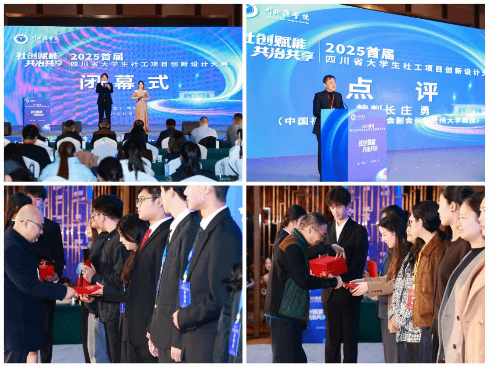 赛事在闭幕式暨颁奖仪式中迎来尾声。闭幕式上,中国社会工作教育协会副会长、大赛裁判长庄勇教授对赛事进行点评,其高度赞扬了参赛项目所展现出社会工作专业学生所展现出的专业能力与创新能力,也给予了四川省社会工作专业人才培养的成效作出了积极评价。在颁奖环节,颁奖嘉宾对获得一、二、三等奖的参赛队伍及优秀指导教师进行了颁奖。