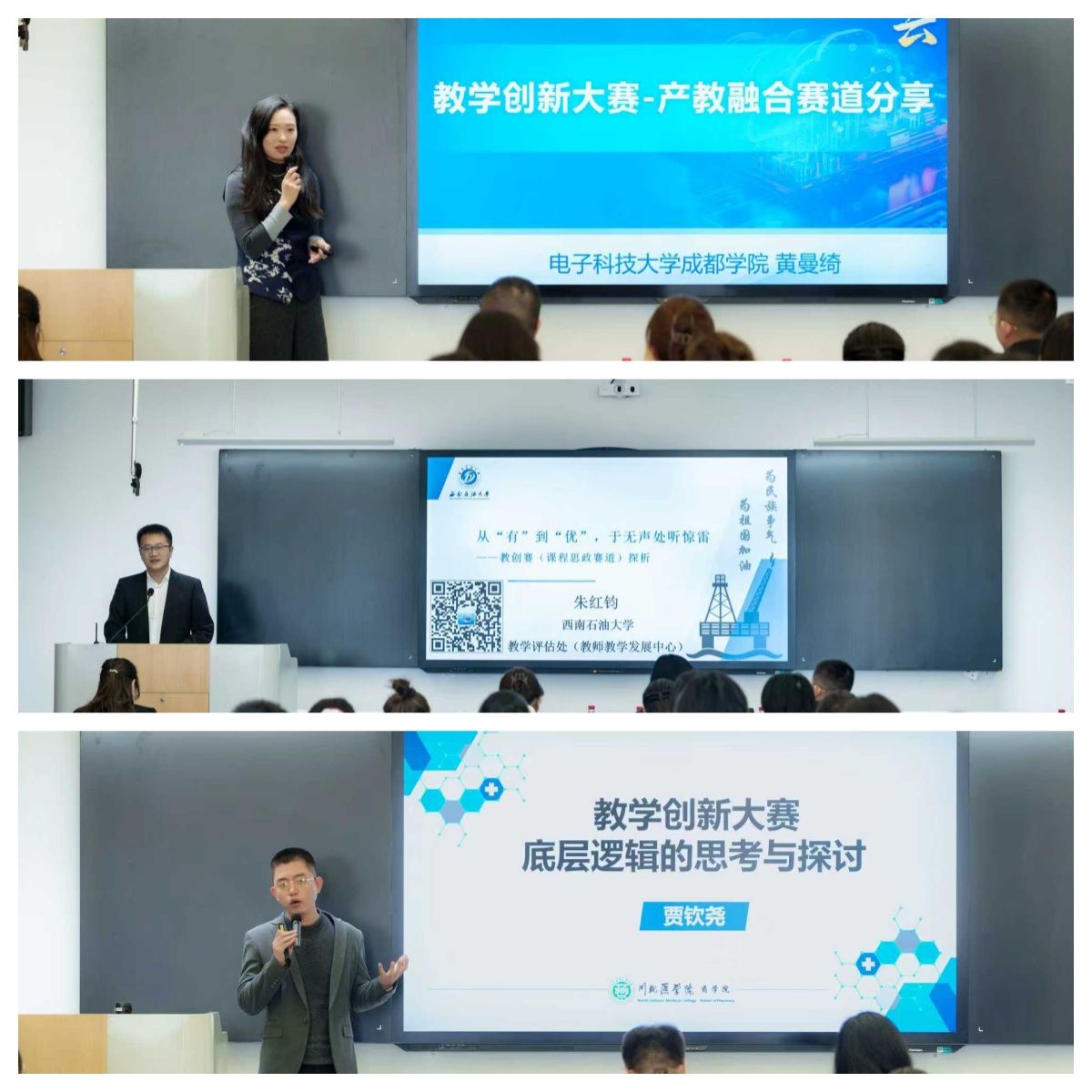 培训环节,黄曼绮教授聚焦产教融合赛道,从创新报告撰写、课堂实录要点、教学汇报设计等方面分享了参赛经验;朱红钧教授围绕课程思政赛道,分析了思政教学常见问题并提出优化路径,结合典型案例阐释了专业与思政的深度融合;贾钦尧副教授基于新医科背景,从课程重构与实践改革角度探讨了教学创新的底层逻辑。