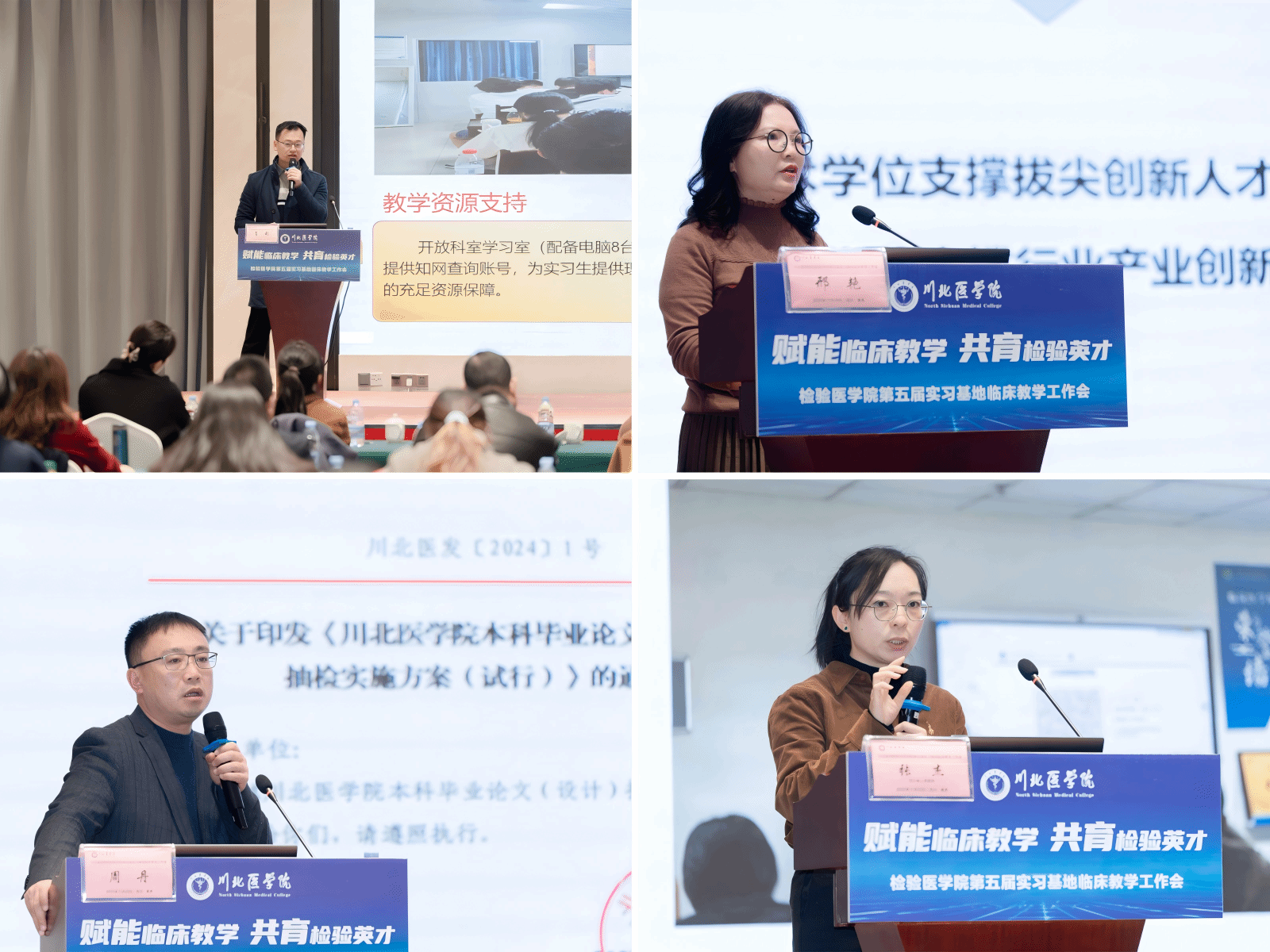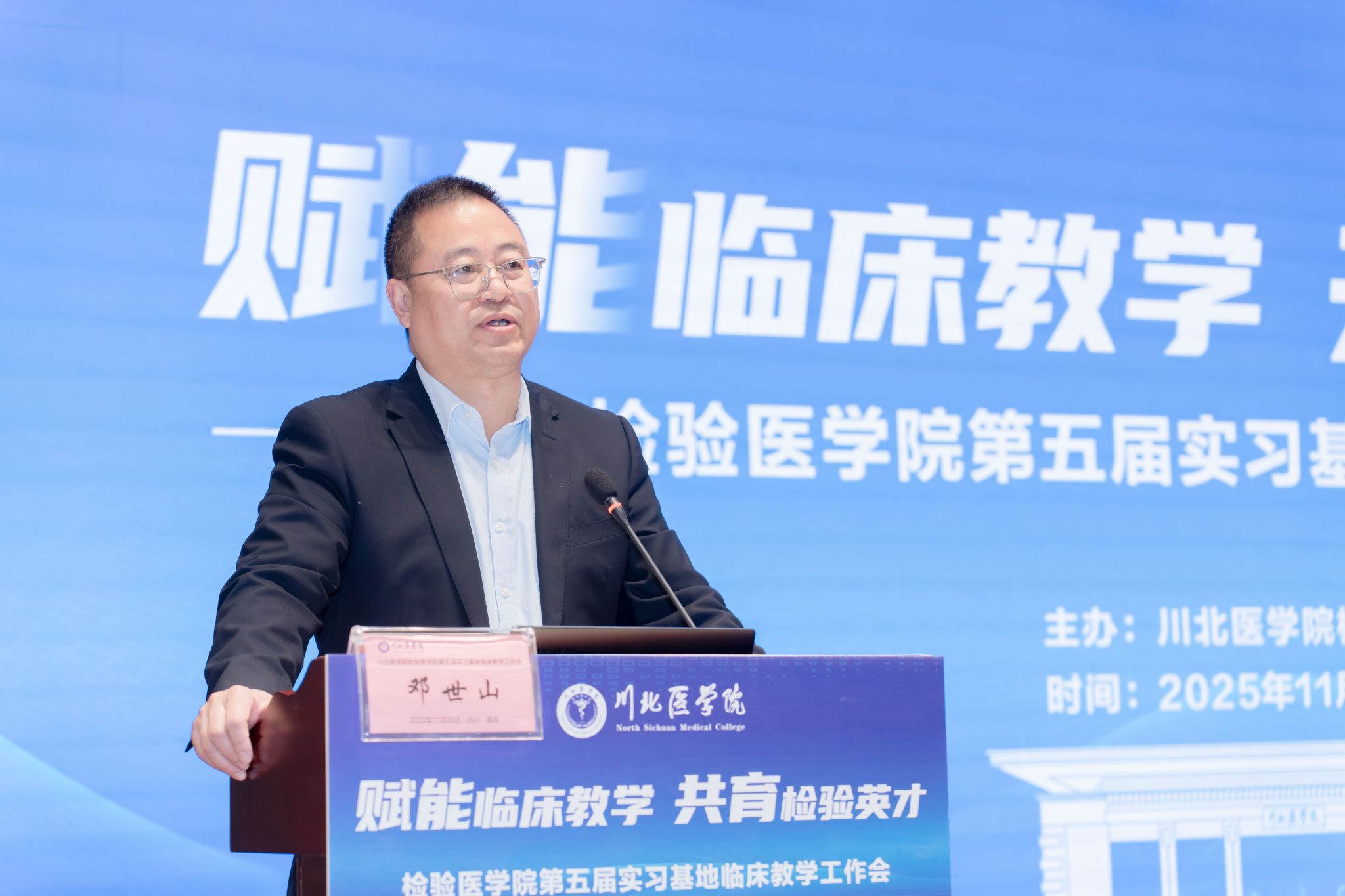 邓世山在致辞中指出,今年是“十四五”收官与“十五五”谋篇的关键节点,实习基地作为医学检验人才培养的核心支撑与理论实践衔接枢纽,其质量直接影响学生专业素养与实践能力提升,作用至关重要。实习基地经验分享环节,四川省人民医院临床检验中心副主任张杰、自贡市第一人民医院检验科主任肖利、宜宾市第二人民医院检验科主任聂滨,结合各自单位实践,分别分享了实习带教创新、学生培养及毕业论文指导质量管控的经验与思路。随后,研究生工作部(处)长邢艳围绕“硕士生导师队伍建设及导师遴选、管理、考核”,解读政策精神、导师遴选标准与管理规范,为实习基地参与研究生培养提供指引。教务处副处长周丹围绕“本科毕业论文管理规范”展开讲解,紧密衔接国家教育政策导向与学校工作实际,从政策背景、毕业论文抽检、学术标准、实践挑战等方面提出论文质量提升要求。