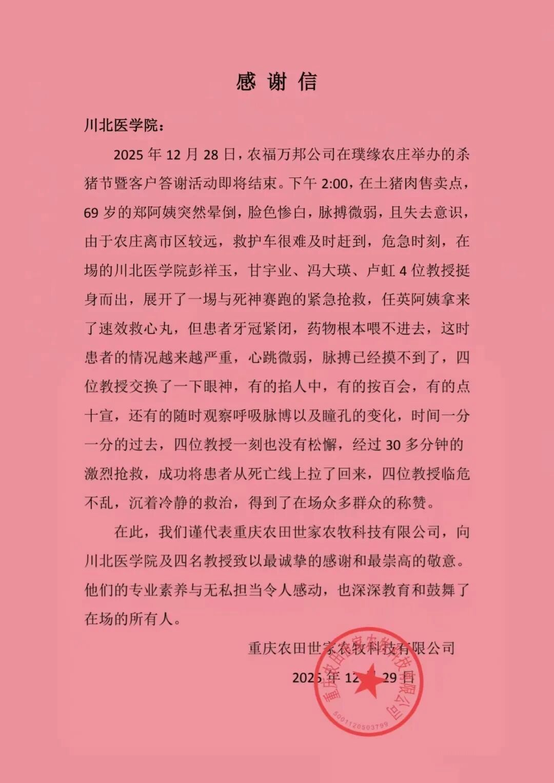 重庆农田世家农牧科技有限公司在感谢信中这样写道:“他们的专业素养与无私担当令人动容,不仅成功挽救了生命,更深深教育和鼓舞了在场每一个人,用实际行动生动诠释了‘医者仁心’的使命与担当。”