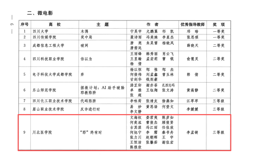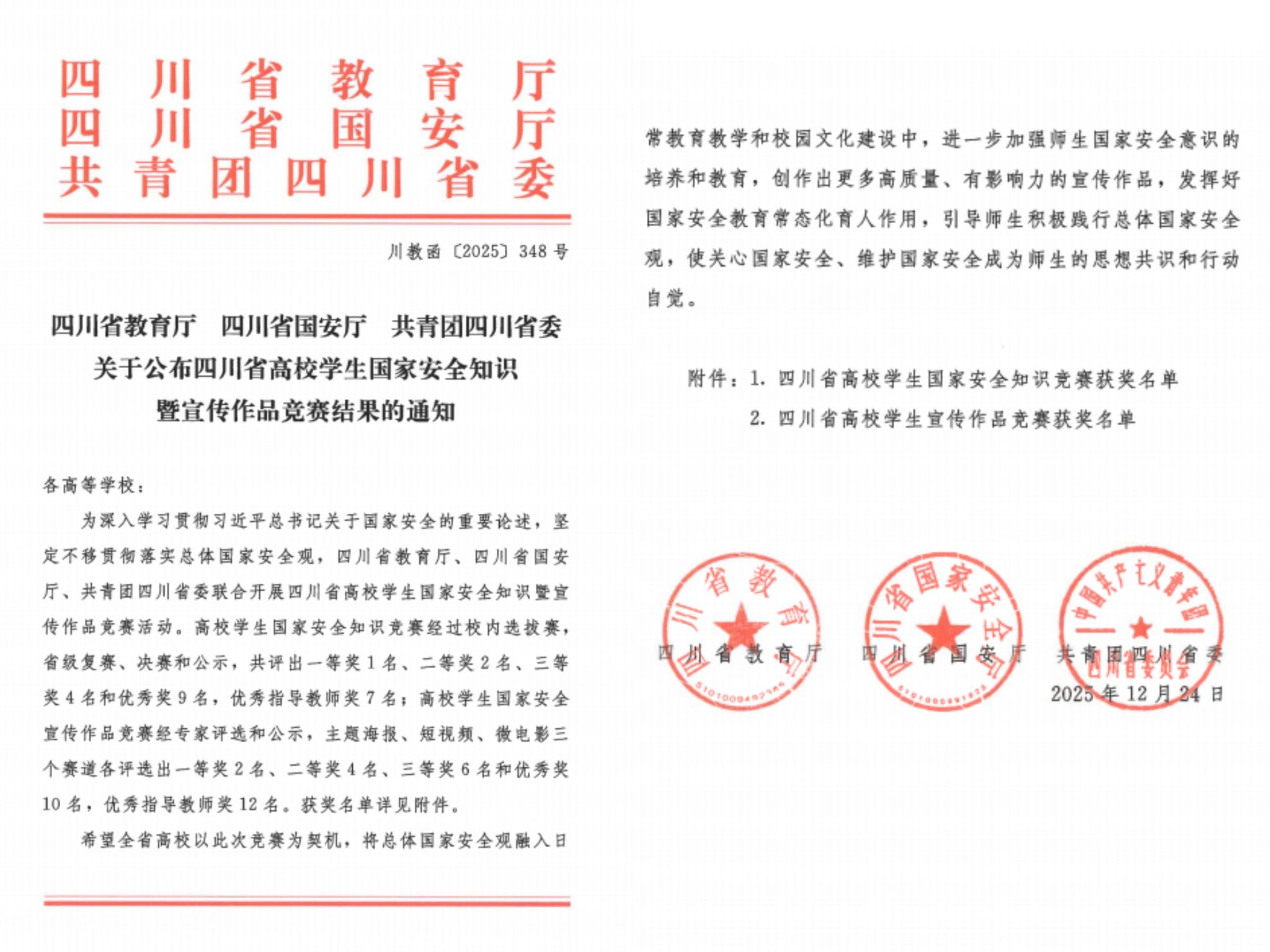 近日,由四川省教育厅、四川省国安厅、共青团四川省委联合主办的2025年四川省高校学生国家安全知识暨宣传作品竞赛结果正式揭晓。我校报送的微电影《“邪”终有时》作品凭借深刻的主题立意和扎实的内容,荣获微电影赛道三等奖,指导教师李孟锜及学生文海权、何奕泓等创作团队获表彰。