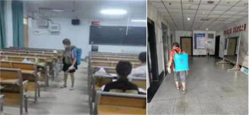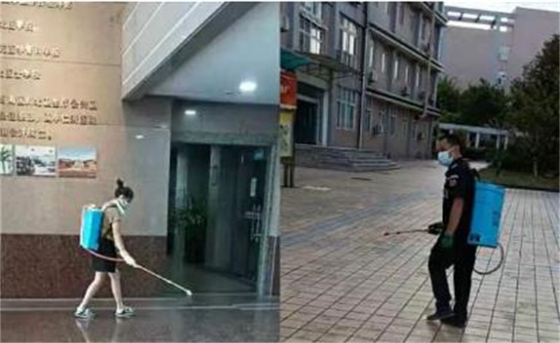 抗击疫情,消杀工作至关重要,只有确保消杀无死角,才能筑牢校园安全屏障。每天清晨天刚蒙蒙亮,后勤管理处校园管理中心工作人员就背起装满消毒水的沉重喷雾器开始了消杀工作,办公楼、教学楼、公寓楼、食堂……每个场所都不放过,走廊、门把手、桌椅脚、洗手台、公厕便池……每个小细节都仔细消毒,这样的消杀程序每天要进行早晚两次。