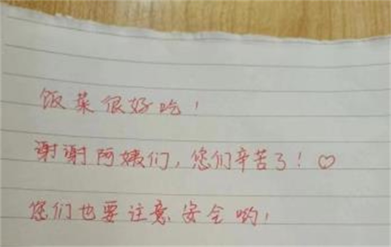 “饭菜很好吃,谢谢阿姨们,你们辛苦了!你们也要注意安全哟。”隔离点学生手写的感谢便签让公寓值班员们很欣慰。
