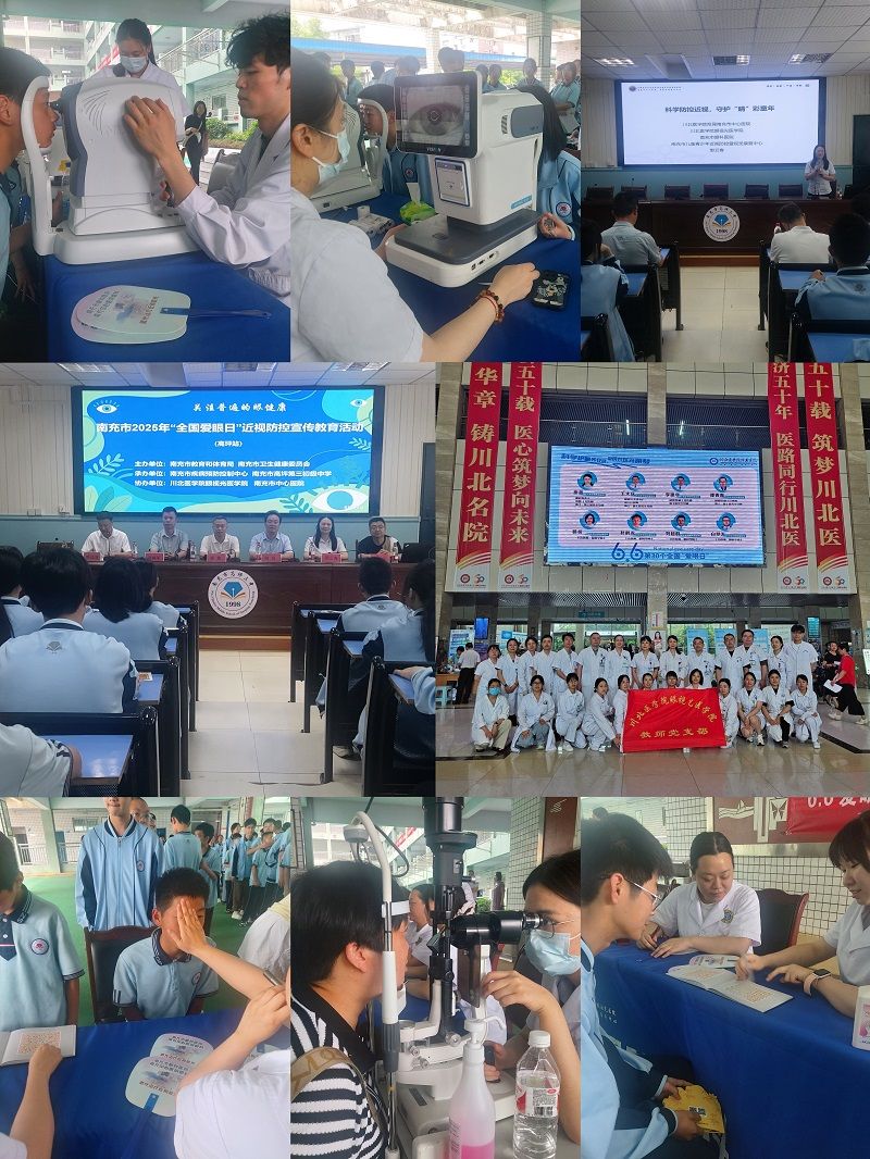 在第30个全国“爱眼日”到来之际,眼视光医学院以“科学护眼齐行动,全面共筑光明梦”为主题,组织党员教师、附属医院眼科专家及学生志愿者在高坪第三中学、学校附属医院门诊大厅开展近视防控科普宣教、眼健康筛查义诊等系列志愿服务活动。本次活动覆盖青少年学生、社区居民、就诊患者等群体,累计服务上600余人次,以实际行动践行初心使命,为守护全民眼健康注入“红色动能”。
