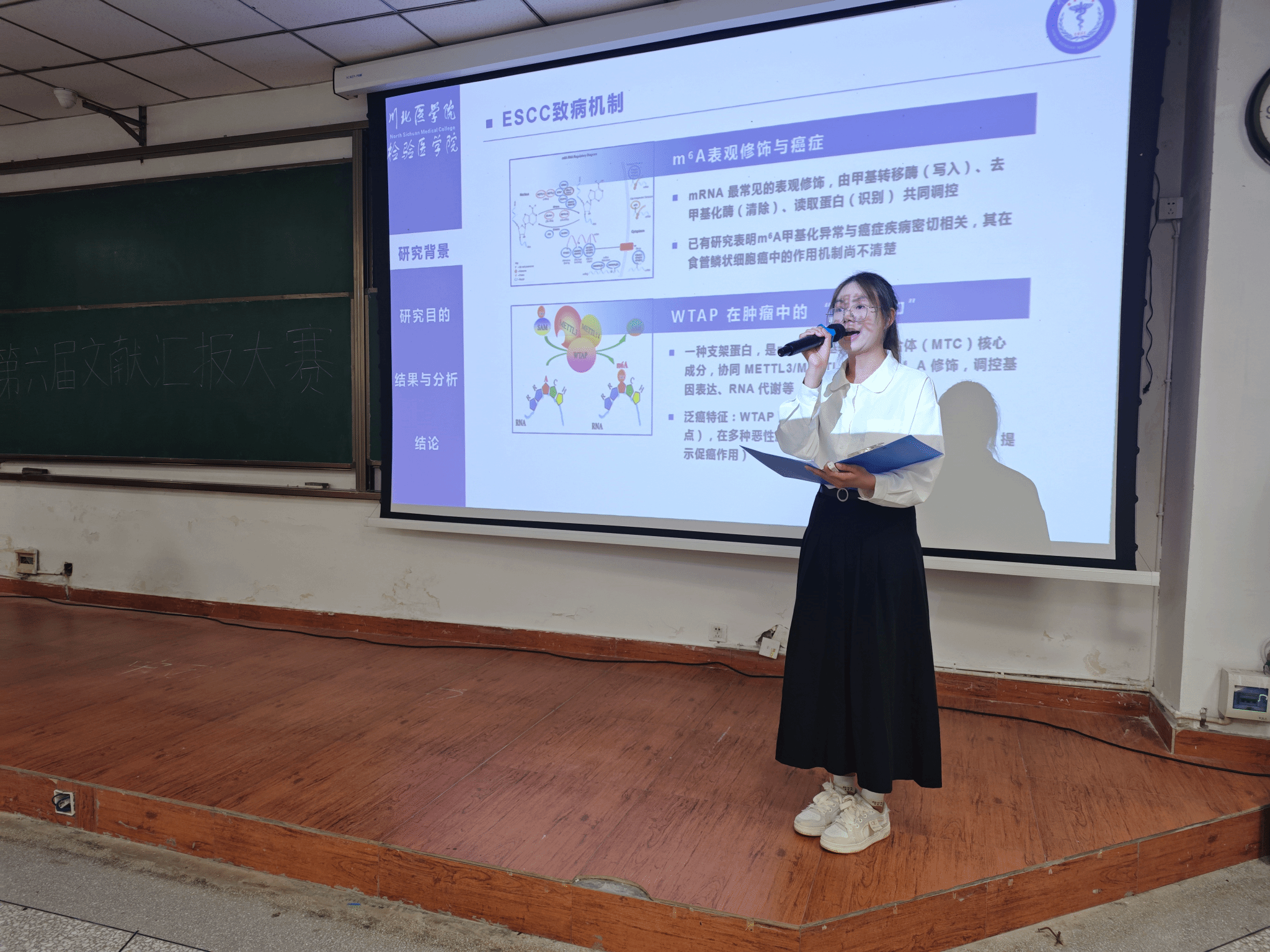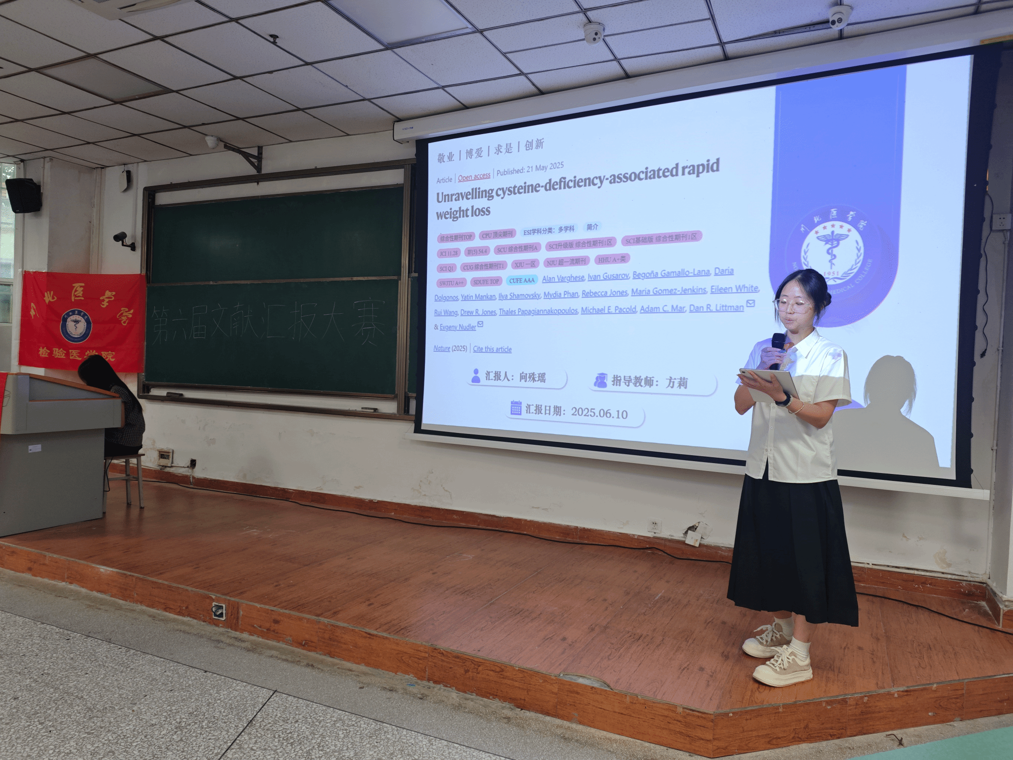 6月10日,检验医学院于图信楼107教室举办第六届文献汇报暨专创融合课程风采展示大赛,经过初赛选拔,8名选手进入决赛。检验医学院副院长方莉,党总支副书记郭斌,临床微生物教研室钟晓武,临床免疫教研室肖林,转化医学研究中心助理研究员龚凤担任评委,学院2023、2024级全体同学观摩比赛。