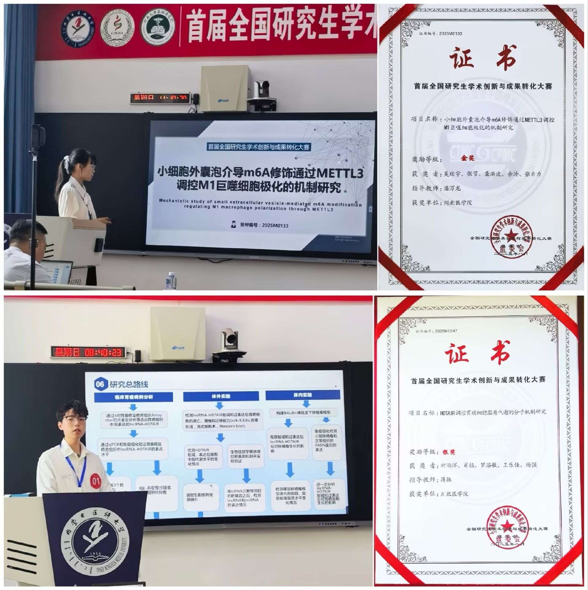 本次比赛共四类赛道,涵盖基础医学、临床转化及交叉学科前沿领域,决赛内容包括现场汇报、专家提问。吴欣宇同学现场汇报了题为《小细胞外囊泡介导m6A修饰通过METTL3调控M1巨噬细胞极化的机制研究》的报告,探讨了sEVs递送的表观遗传调节因子调控巨噬细胞极化的分子机制,并分享了相关研究成果。何雨洋同学汇报了《HOTAIR介导FASN调控胃癌细胞脂肪酸代谢的机制研究》的研究报告,聚焦胃癌脂质代谢重编程的关键机制,发现长链非编码RNA HOTAIR在胃癌组织中特异性高表达且与患者总生存率显著负相关创新性发现FASN/miR-195/HOTAIR形成正反馈调节环路,驱动胃癌细胞脂质代谢异常,从而为胃癌靶向治疗提供依据。