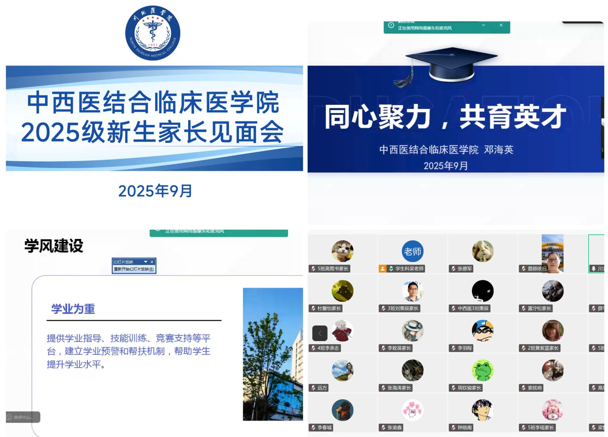 为促进家校协同育人,助力2025级新生顺利开启大学生活,9月24日,中西医结合临床医学院通过腾讯会议平台召开2025级全体新生家长线上见面会。学院党总支副书记邓海英、副院长刘浩及全体辅导员与160余名家长"云端"相聚,围绕"专业发展、成长规划、家校共育"等主题展开交流。