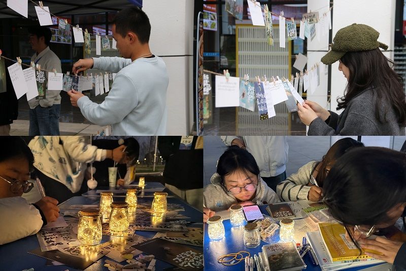 活动前期通过QQ、微信等平台进行广泛宣传,引导学生积极参与,线下分别在可园、雅园、瑞园餐厅入口设立易拉宝并布置雨棚、悬挂麻绳、灯带等设施,营造温馨氛围。活动期间,通过“明信片倾诉-匿名回复”的互动形式,同学们在明信片上匿名写下自己的烦恼、困惑或心事,并悬挂于活动现场,也可浏览并回复他人的明信片,给予理解、鼓励与建议。同时各点位工作人员有序引导,确保内容合规、隐私受护,现场秩序井然。大家纷纷表示,这种形式既保护了隐私,又拉近了彼此的心理距离,让人感受到“被听见、被理解”的温暖。活动现场共悬挂明信片1080张,发放木制夹子1000个、彩色笔54支、信纸200本、便利贴100个、修正带50个、许愿瓶100个作为互动礼品。