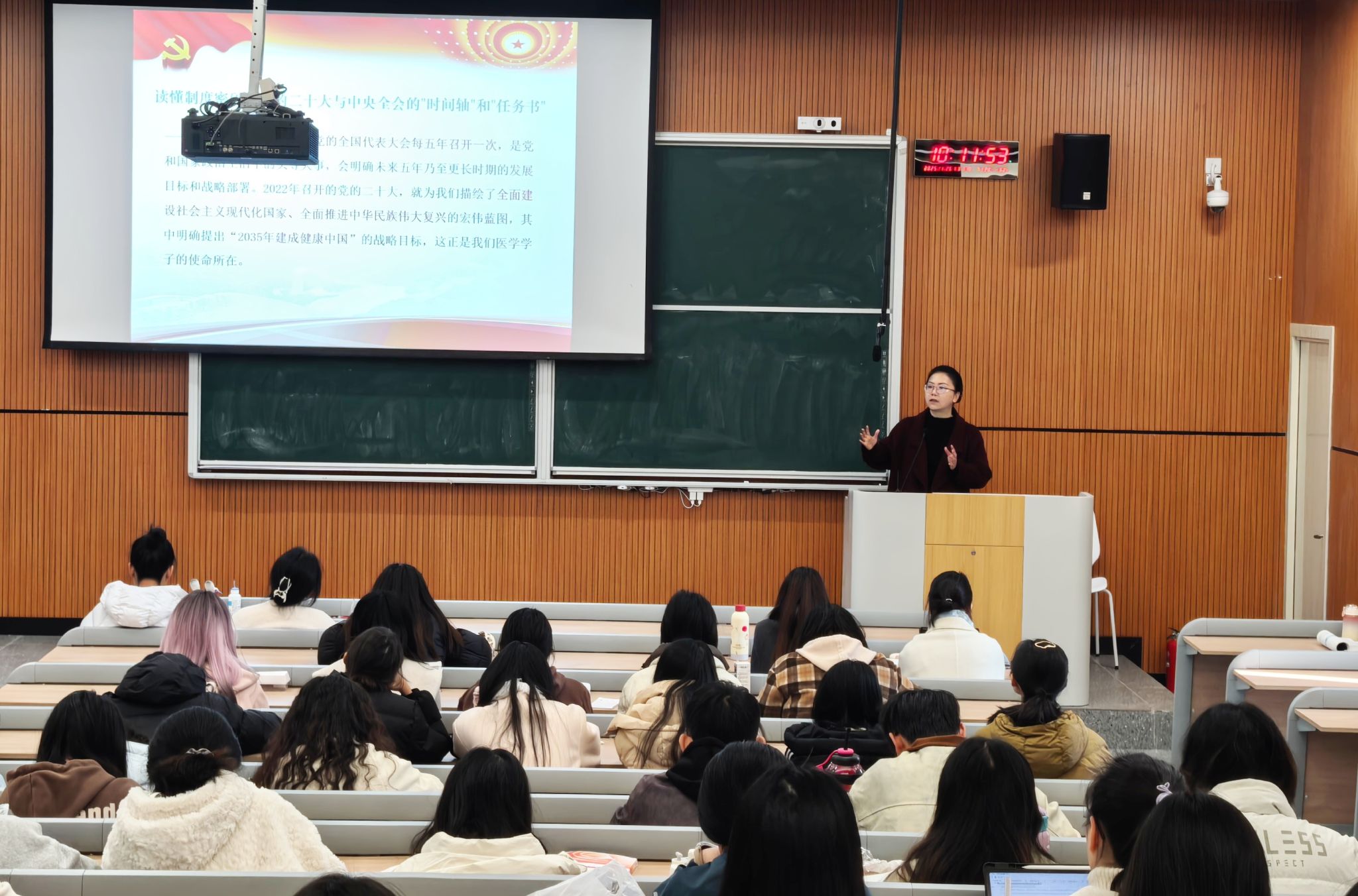 课堂上,夏榕首先引导学生“读懂制度密码”,系统梳理了党的全国代表大会与中央全会的职能定位与发展脉络,清晰解析了各次全会的主要职责。她结合历史实践,深刻阐释了党的二十届四中全会的重要意义,并指出,“十五五”规划建议将“加快建设健康中国”列为核心任务,为医学影像事业发展指明了前进方向。随后,在“锚定时代坐标”部分,夏榕深入剖析了国家战略与学科发展的紧密联系。她强调,在“健康优先”“数智化”等政策推动下,云胶片、AI辅助诊断等技术正快速普及,影像诊断的精准性日益关键。她由此激励学生,要夯实专业基石,精进诊断能力,努力成长为兼具精湛技艺与家国情怀的卓越影像人才。