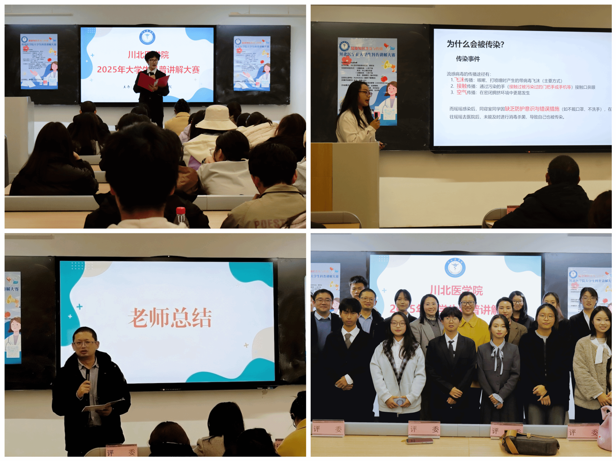 11月27日晚,由公共卫生学院联合教务处主办的川北医学院2025年大学生健康科普讲解大赛决赛在博济楼东103教室顺利举办。经过初赛选拔,来自全校各院系的10名优秀选手脱颖而出,在决赛舞台上展现了健康科普的青春力量。