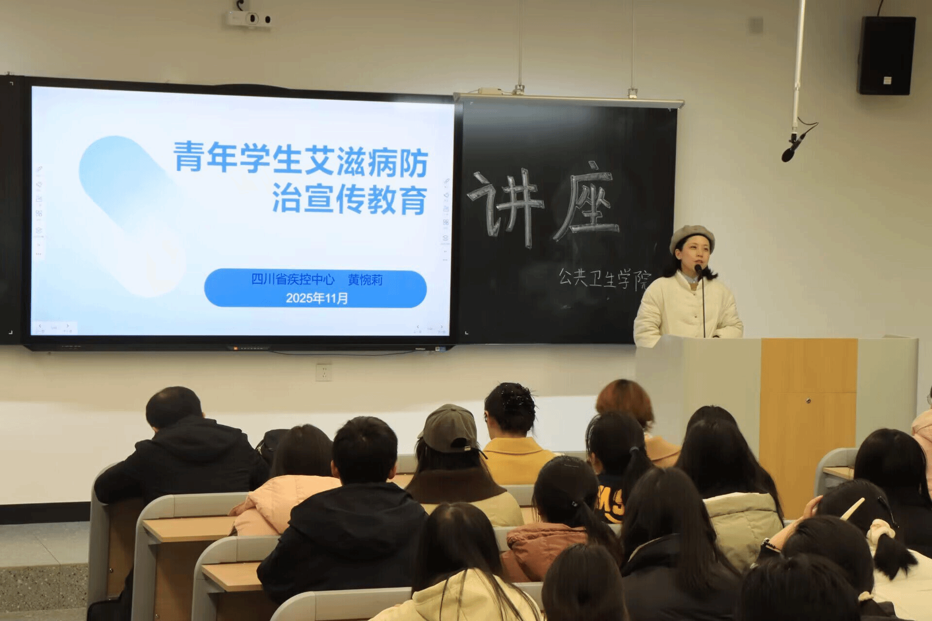 在2025年“世界艾滋病日”宣传活动之际,11月28日上午,公共卫生学院于德启楼西206教室为2025级预防医学专业新生举办“青年学生艾滋病预防与自我保护”专题讲座。讲座特邀四川省疾病预防控制中心黄惋莉主任医师主讲。